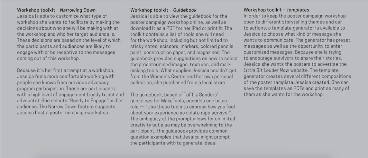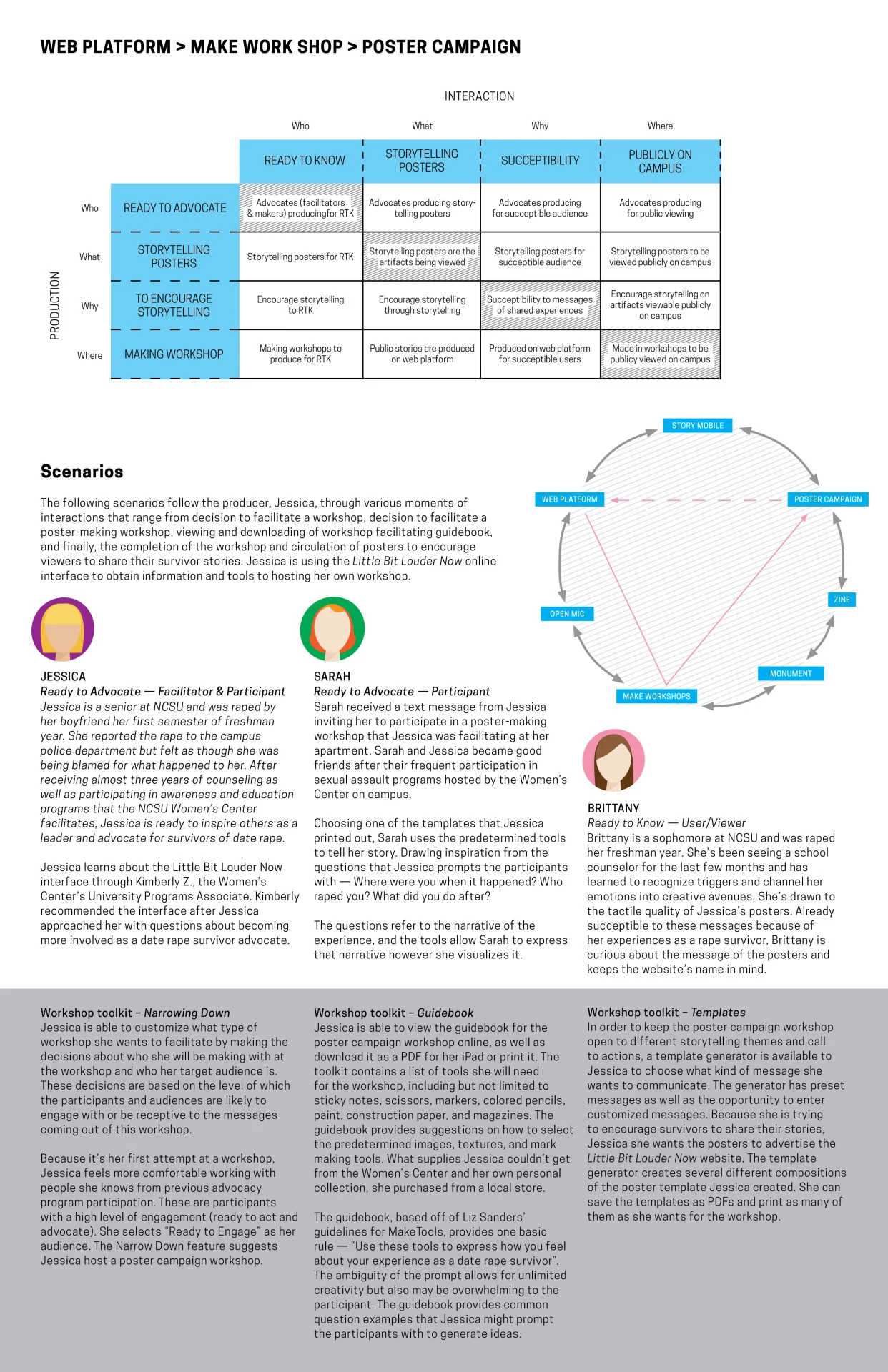 The scenarios follow potential users through a path that would produce a poster campaign. Wanting to become a student leader in advocacy for survivors of sexual assault, Jessica (advocate) seeks resources to facilitate a making workshop that will produce user generated artifacts (posters) to encourage other survivors to share their experiences via the web platform. The web platform contains an archive of stories for users to sort through as well as submit their own via blog-like style.
