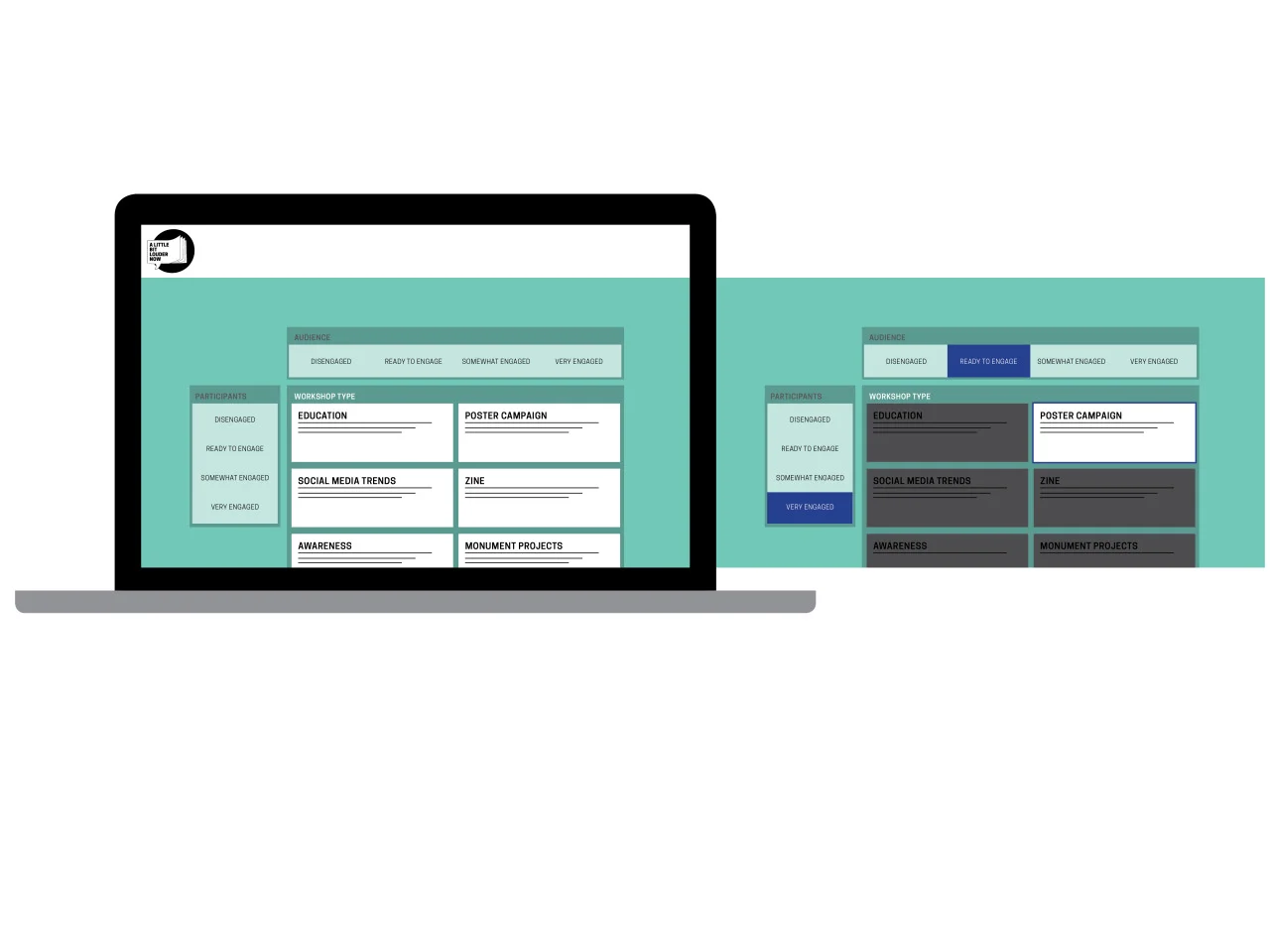 The two studies look at ways in which an advocate user can narrow down what kind of workshop she’d like to facilitate. The first option is simplified and easy to figure out, but the second option provides a matrix method in order to see all of the different options available.