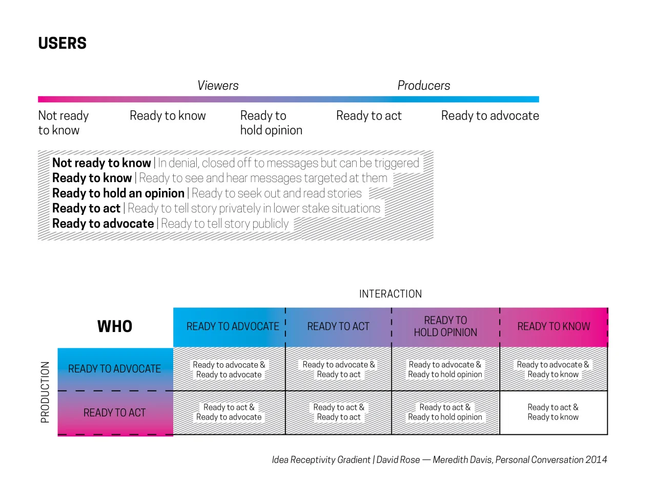 The users, positioned among David Rose’s Gradient of Idea Receptivity, have vary levels of engagement and receptivity, causing them to interact with multiple parts of the system either as a producers or as viewers/actors (sometimes both). For example, a user who is ready to advocate may seek out services for facilitating a workshop that will make posters to urge other users to tell their story via the web platform or an open mic program that they will later set up.