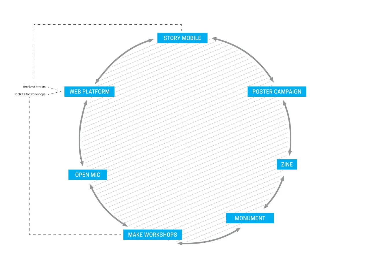 The map may be incorrect in a way that implies that everything can happen at the same time (users are moving through different paths of the cycle at the same time). While users can move through different paths of the cycle at the same time, The Story Mobile is an investigation if how services for storytelling facilitation can engage users in a physical manner. The mobile is temporary, traveling to campuses for a week out of the year, but it manifests itself as a digital/web platform for the remainder of the year. Users can enter the cycle as participants of the Story Mobile (a service that benefits different levels of engagement) or because of awareness about the mobile due to earlier or current output from the service.
