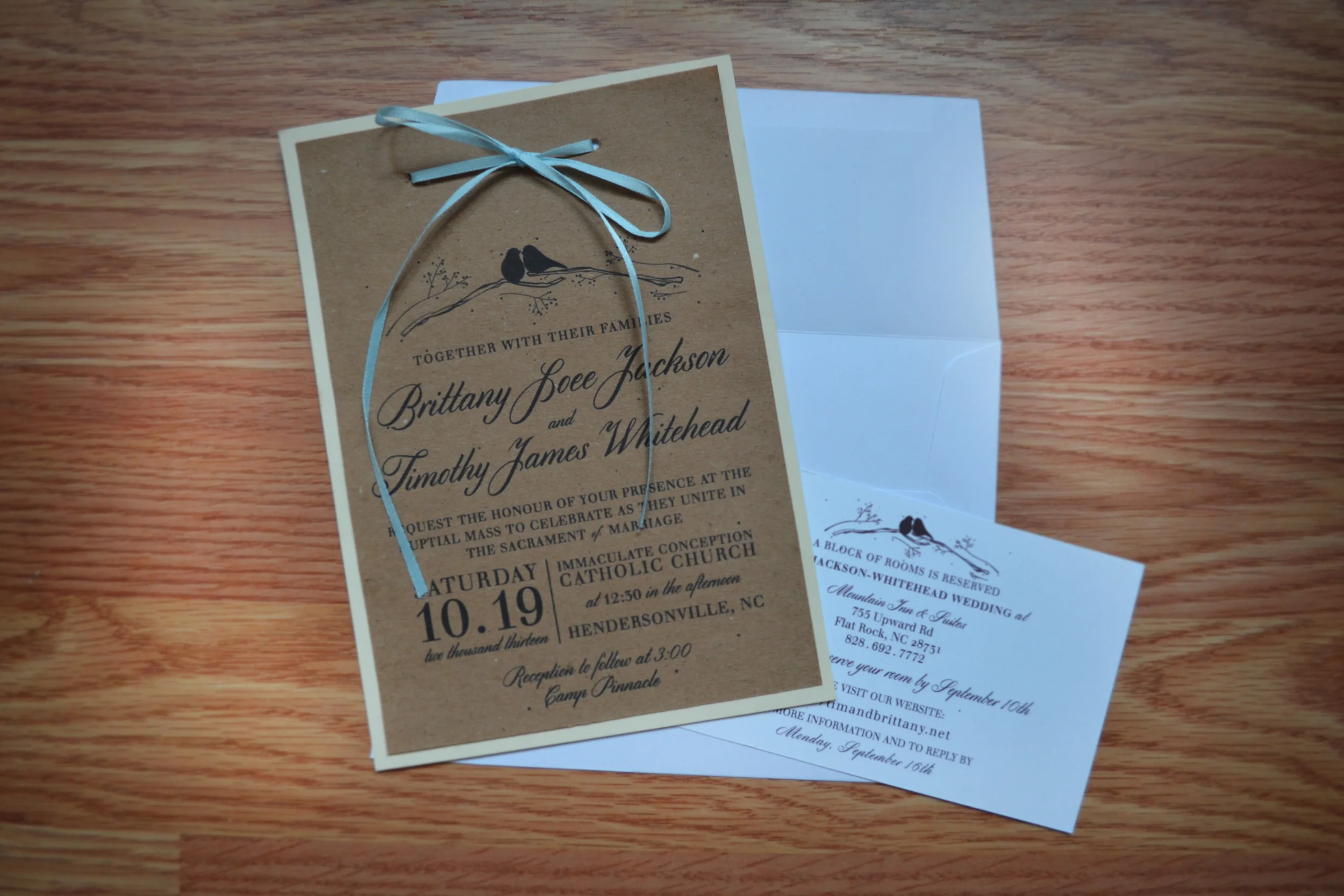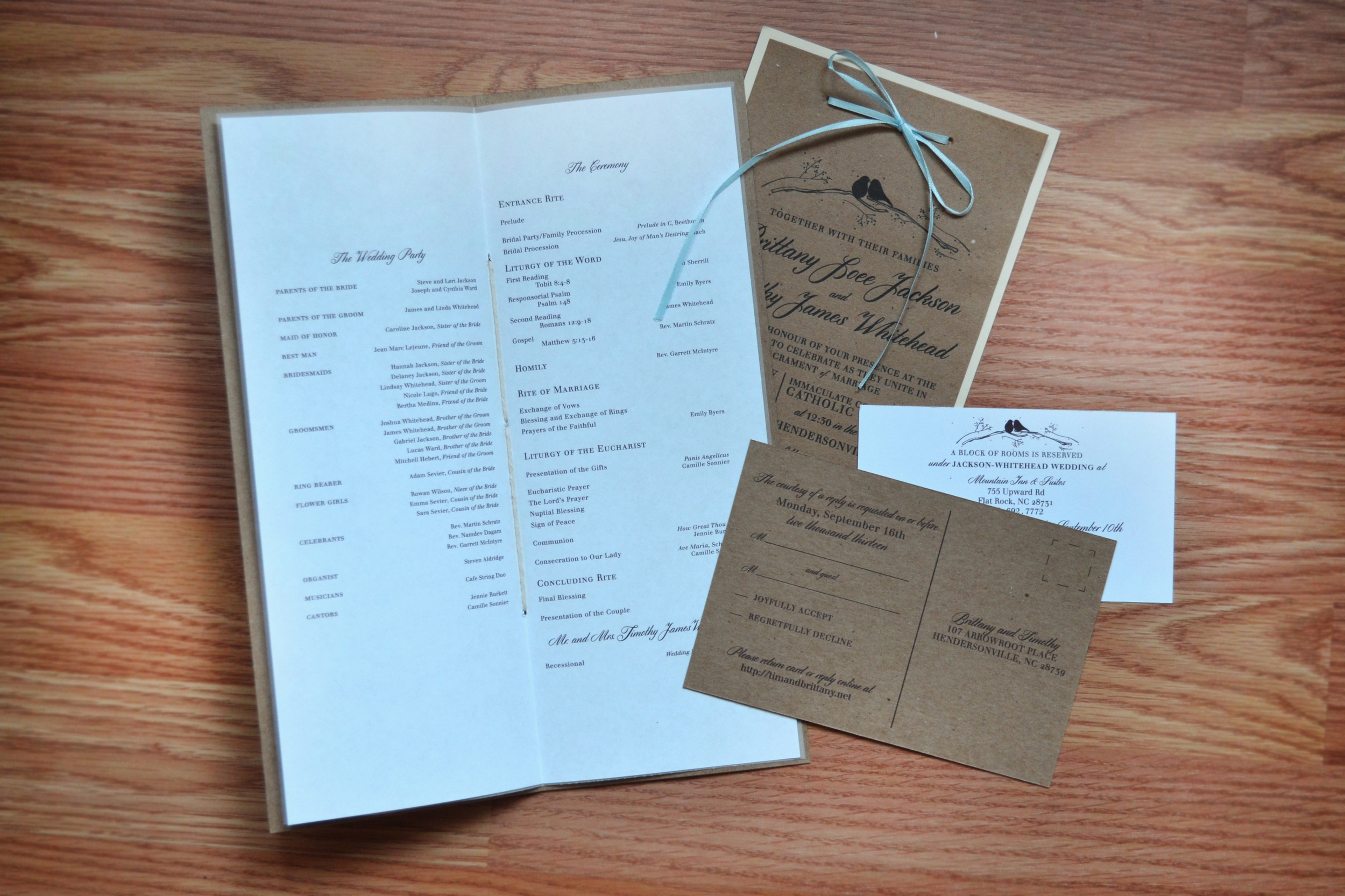 Brittany Jackson and Tim Whitehead approached me in the summer of 2014 to design and produce print elements for their wedding. The package included invitations, information inserts, RSVP cards, ceremony programs, and a wine label.
